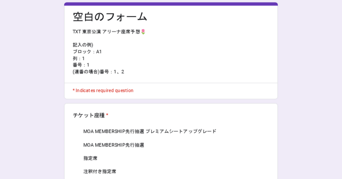 回答用のGoogleフォームを作成してますので、アリーナチケットをお持ちの方は上記の例を参考にご記入ください。
